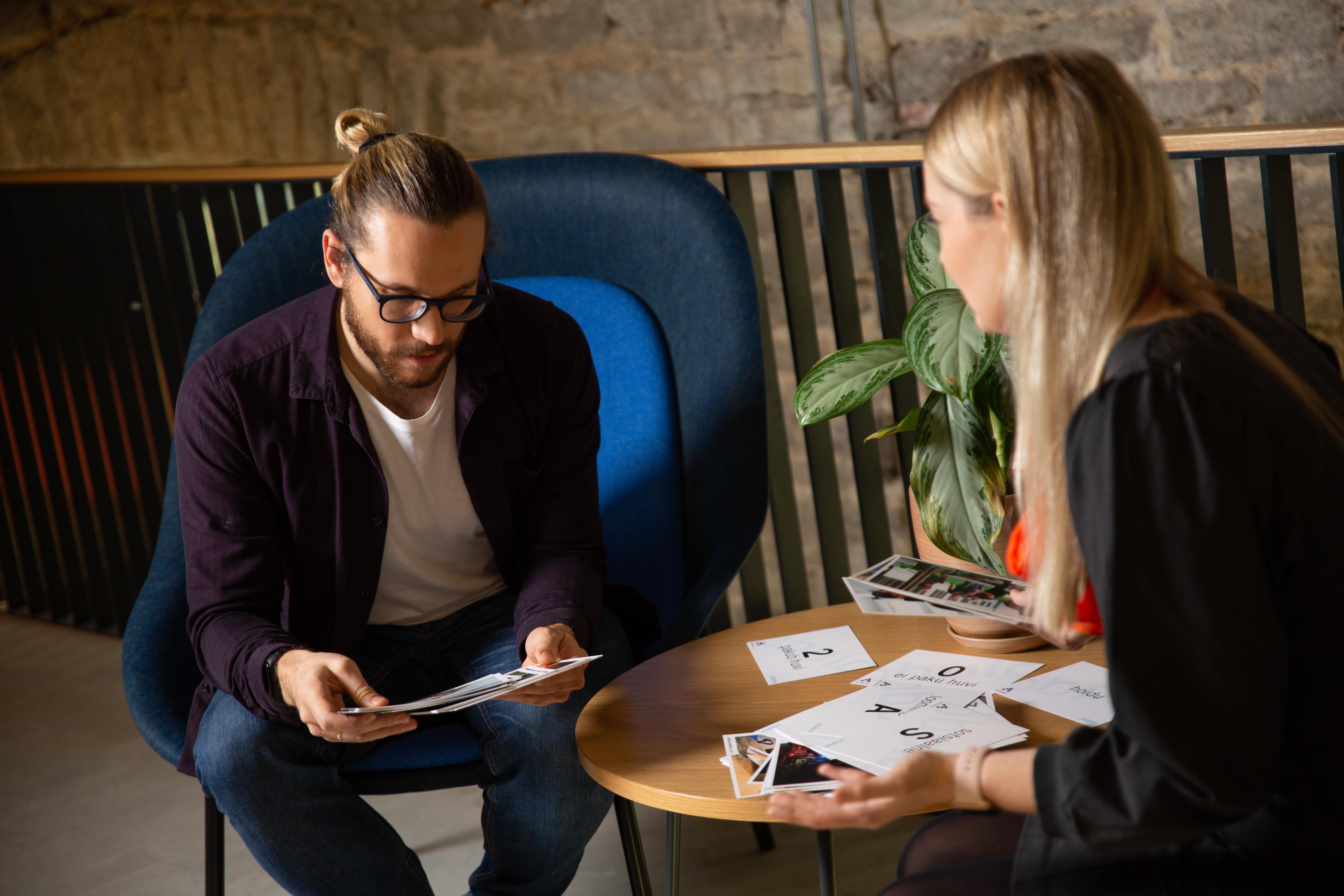 Töötukassa pildikeel on helge, soe ja sõbralik. Piltidel on läbiv naturaalne soe kollakas valgus, nagu päike paistaks. Mitte kunagi ei tohiks piltidel paista ebanaturaalne välk. Foto rakurss peaks olema pildil olevate inimestega sama kõrge. Võimalusel võiks taustal olla väike roheline aktsent.